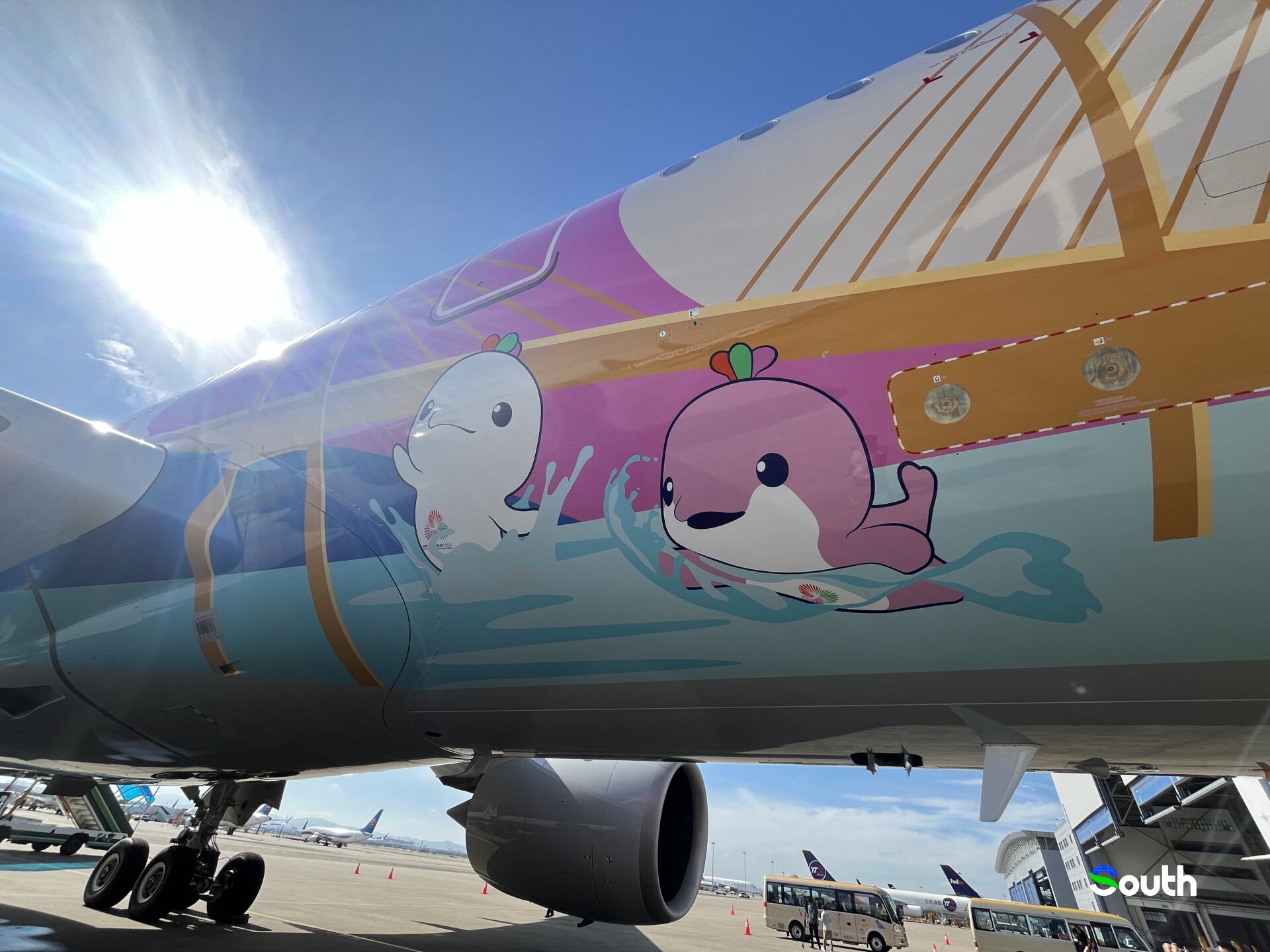 The Airbus A350 features a full-body exterior paint that consists of the Guangdong-Hong Kong-Macao Greater Bay Area and global landmarks, linked by the Hong Kong-Zhuhai-Macao Bridge. The design uses 48 colors and was completed by a team of 65 engineers over 17 days, employing advanced projection and flattening techniques to ensure accurate reproduction on the curved fuselage.