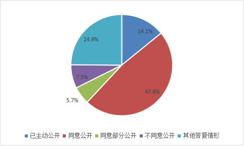全市各级行政机关共答复政府信息公开申请4375宗。其中,属已主动公开范围616宗,占14.1%;同意公开2089宗,占47.8%;同意部分公开250宗,占5.7%;不同意公开329宗,占7.5%;其他答复情形1091宗,占24.9%。