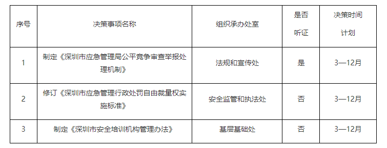 深圳市应急管理局2023年度重大行政决策事项及听证事项目录