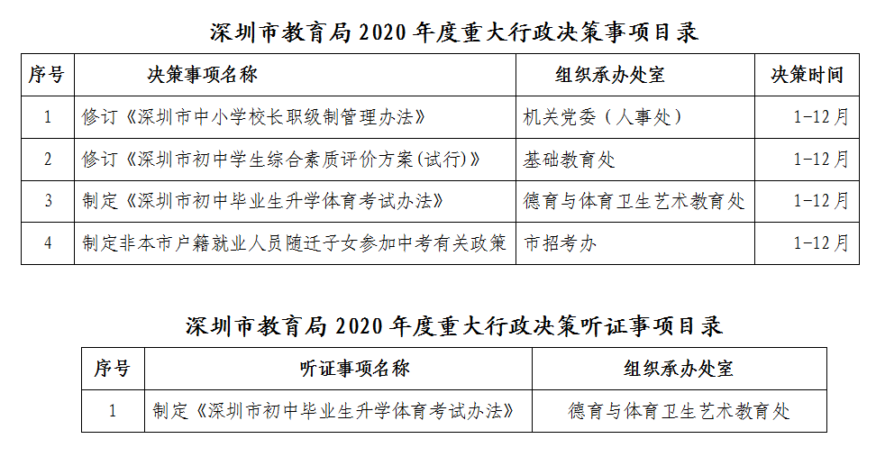 根据《市法治政府建设领导小组办公室关于做好2020年度重大行政决策事项有关工作的通知》的要求,我局制定了《深圳市教育局2020年度重大行政决策事项目录》和《深圳市教育局2020年度重大行政决策听证事项目录》。现印发给你们,请按相关规定认真组织实施。