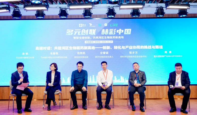 在交流对话环节,丹纳赫中国区对外事务副总裁韦春艳、深创投投资总监范伟民、莱芒生物研发负责人仝督读、深圳市生物医药促进会秘书长张才万、重庆威斯腾产业转化研究院院长周勇就“共建湾区生物医药新高地——创新、转化与产业协同的挑战与路径”进行交流。