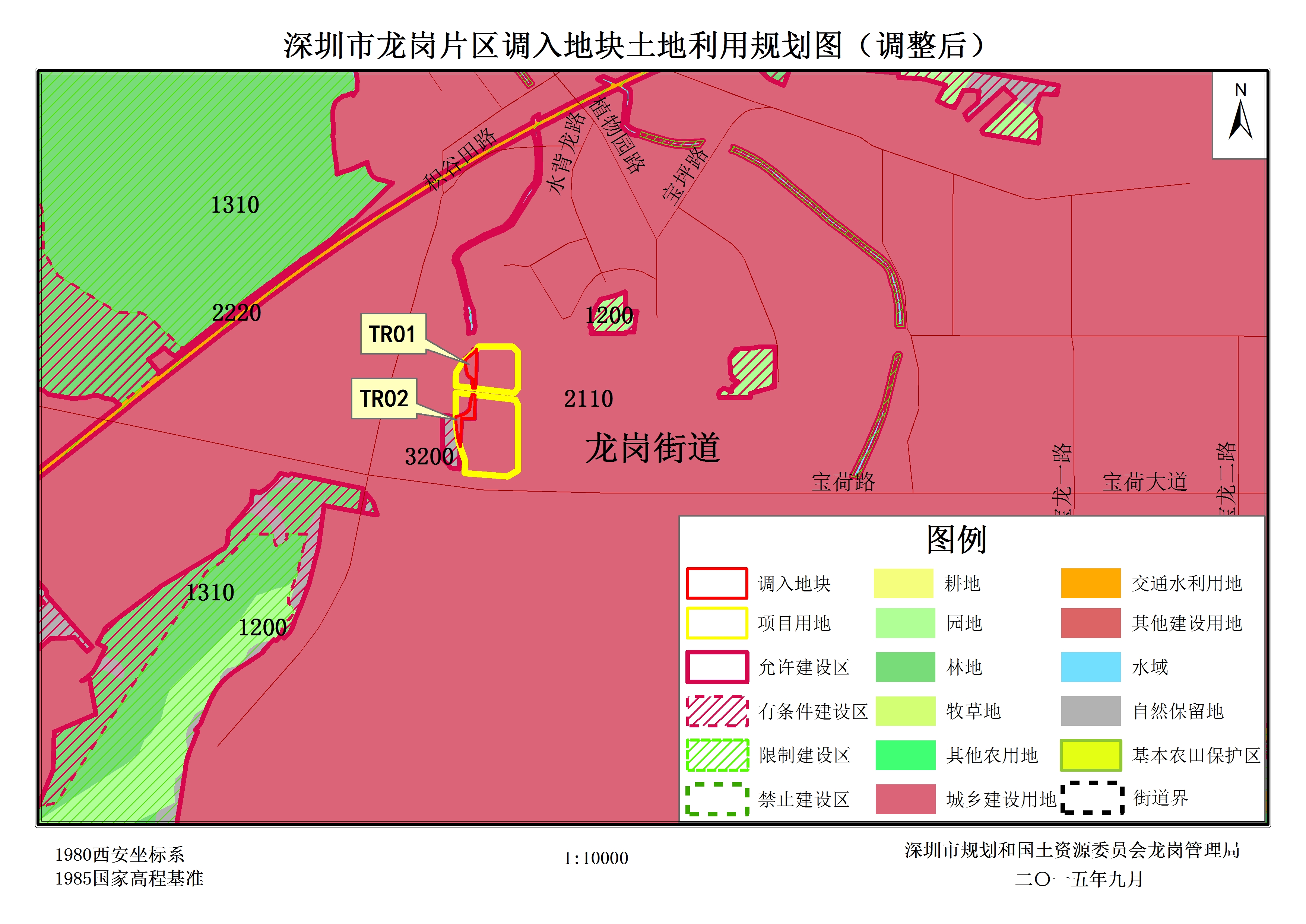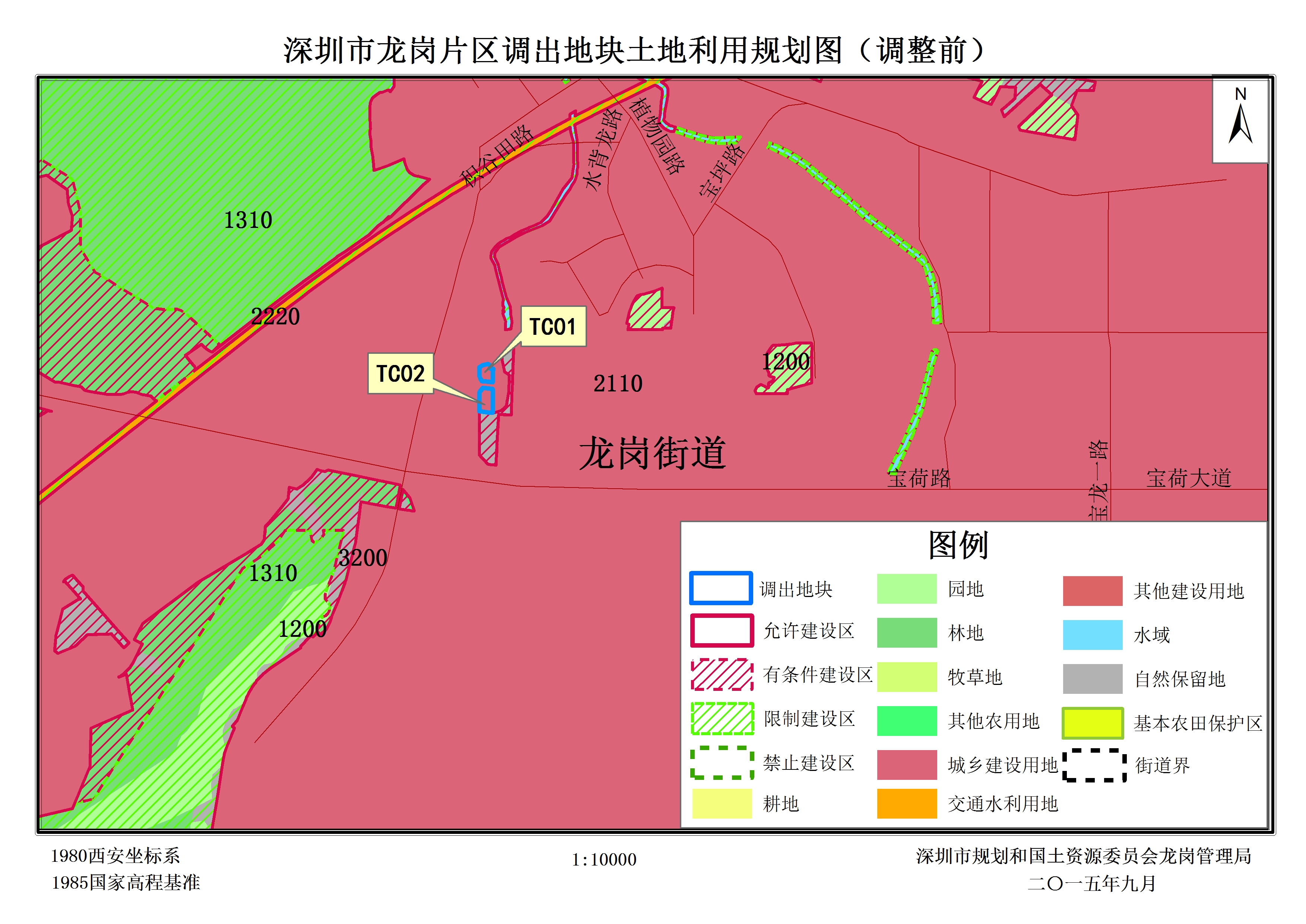 二、调出地块2块,面积2719.88平方米,位于龙岗区龙岗街道南约社区。经核查深圳市2014年土地利用变更调查,调出地块01(TC01)土地利用现状为建设用地(空闲地)和未利用地(裸地),面积分别为90.33平方米和994.73平方米;调出地块02(TC02)土地利用现状为建设用地(空闲地)和未利用地(裸地),面积分别为596.80平方米和1038.02平方米。经核查《深圳市土地利用总体规划(2006-2020)》,调出地块在土地利用规划图中全部为城乡建设用地(即允许建设区)。根据[南约地区]法定图则(报签版)中,规划用地性质为绿地(G1)和水域(E1)。
