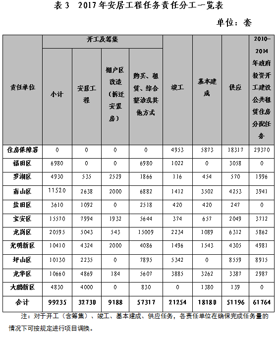 2017年政府投资开工建设的公共租赁住房需累计完成分配入住61764套,按责任单位划分,市本级29370套、罗湖区1996套、南山区3941套、宝安区3712套、龙岗区5862套、光明新区4981套、坪山区8915套、龙华区2987套。