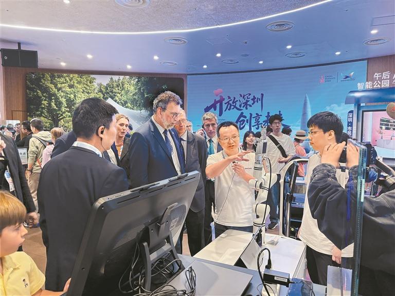 中国馆多功能厅内,“未来深圳社区的一天”交互式体验展区气氛热烈、观众云集。这里集中展示了60余家深圳代表性企业在绿色能源、智能生活、智慧康养等领域的创新成果,沉浸式打造出“深圳创造”的未来生活。