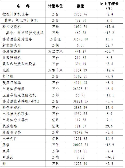 全年规模以上工业销售产值26111.59亿元,比上年增长4.0%。其中,出口交货值11389.39亿元,下降2.2%,占规模以上工业销售产值比重43.6%,比上年下降2.2个百分点。工业产品销售率97.2%,比上年下降0.7个百分点。主要工业产品产量见表6。