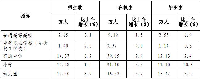 年末全市各级各类学校总数达2310所,比上年增加114所;毕业生44.24万人,招生数55.34万人,在校学生数195.86万人,分别增长6.1%、5.0%和4.3%。年末全市有幼儿园1579所,增加90所;在园幼儿46.33万人,增长5.7%。有小学337所,增加3所;在校学生91.10万人,增长5.3%。有普通中学352所,增加17所;在校学生39.65万人,增长2.9%。全年普通高等学校12所,招生2.85万人,增长3.1%;毕业生2.55万人,增长8.9%;在校学生9.19万人,增长1.5%。