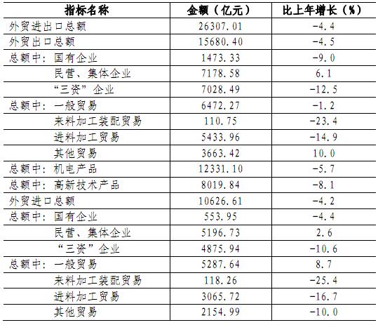 全年外贸进出口总额26307.01亿元,比上年下降4.4%。其中出口总额15680.40亿元,下降4.5%,分别占全国和广东省出口总额的比重为11.3%和39.7%;进口总额10626.61亿元,下降4.2%。出口总额连续二十四年居内地城市首位。