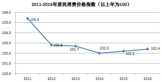 图3 2011-2016年居民消费价格指数(上年为100)