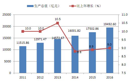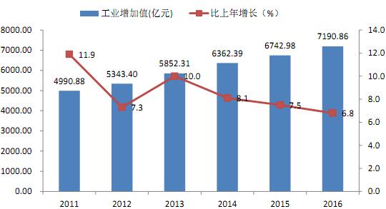 图6 2011-2016年工业增加值及增长速度