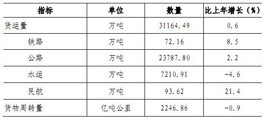 全社会货运量31164.49万吨,比上年增长0.6%。全社会货物周转量2246.86亿吨公里,下降0.9%。