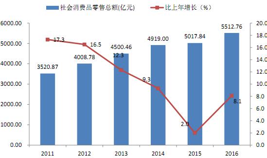 图9 2011-2016年社会消费品零售总额及增长速度
