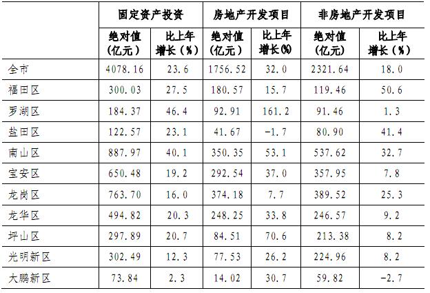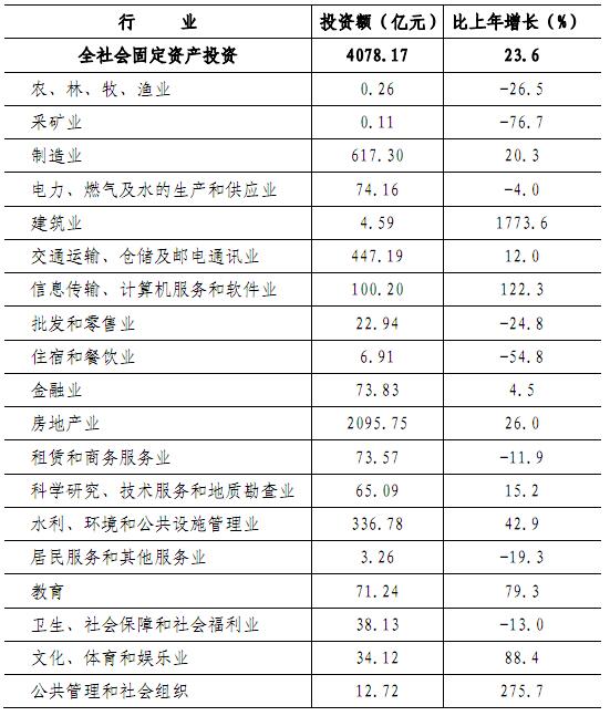 全年完成固定资产投资额4078.16亿元,比上年增长23.6%。其中,房地产开发项目投资1756.52亿元,增长32.0%;非房地产开发项目投资2321.64亿元,增长18.0%。
