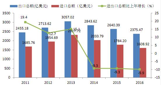 图10 2011-2016年进出口总额及增长速度