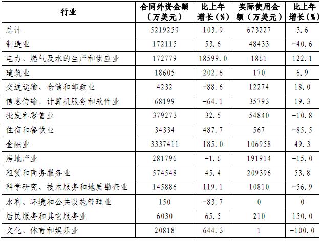 全年新签外商直接投资合同项目4132项,比上年增长23.0%;合同外资金额521.93亿美元,增长103.9%;实际使用外商直接投资金额67.32亿美元,增长3.6%。