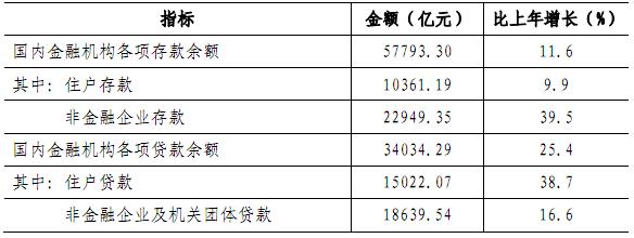 年末全市国内金融机构人民币存款余额57793.30亿元,比上年增长11.6%;国内金融机构人民币贷款余额34034.29亿元,增长25.4%。