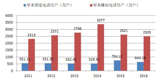 图11 2011-2016年年末电话用户数