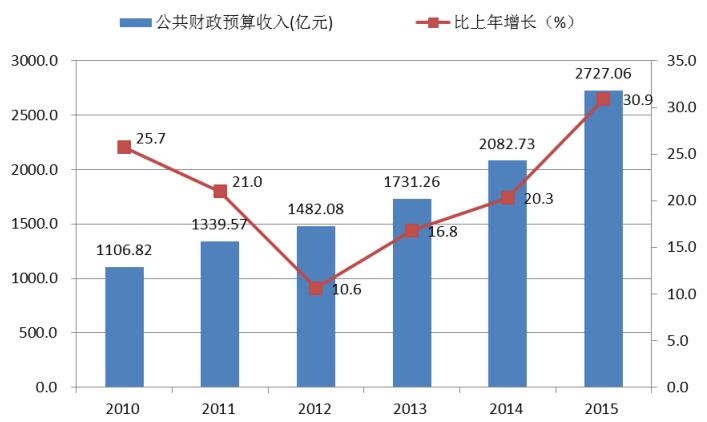 全年完成公共财政预算收入2727.06亿元,比上年增长30.9%。其中税收收入2272.09亿元,增长29.5%。公共财政预算支出3519.95亿元,增长62.5%。