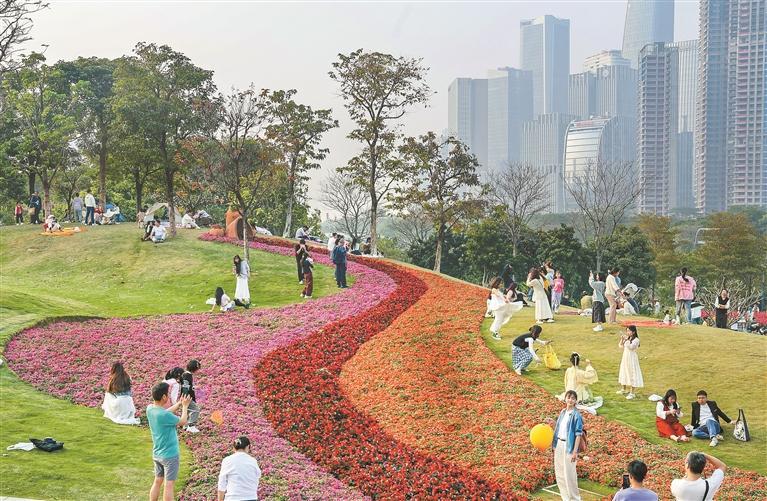 市民们趁着周末暖阳前来踏青,穿梭于花廊,花香伴着欢笑声在园中流淌。游客漫步小径,孩童嬉戏,热闹非凡。趁春光正好,快来深圳赴一场春日之约。