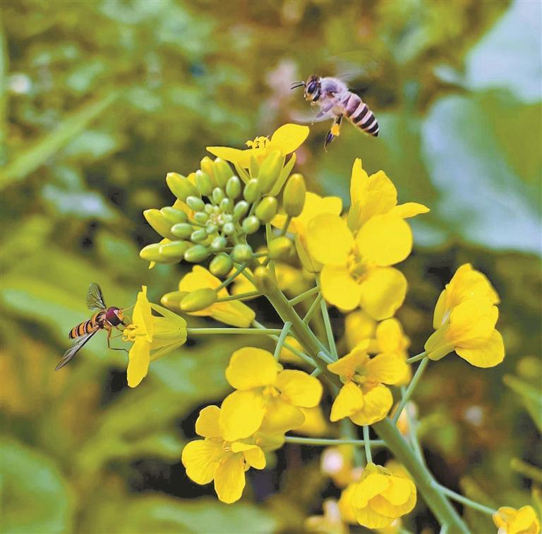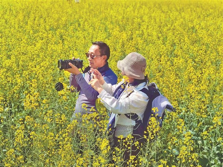 在光明欢乐田园,金黄油菜花一望无际,风拂过,花海翻金浪,与周边景致相映成趣。