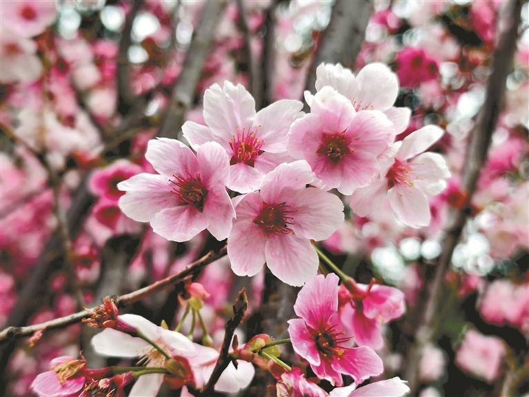 同期,观澜湖生态运动公社第九届樱花节正火热进行,近2000株不同品种樱花绽放。