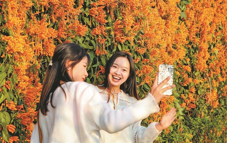 南山区华英路景观公园百米花廊迎来盛景。千万朵炮仗花如瀑倾泻,宛若春日为城市编织的流苏绶带。