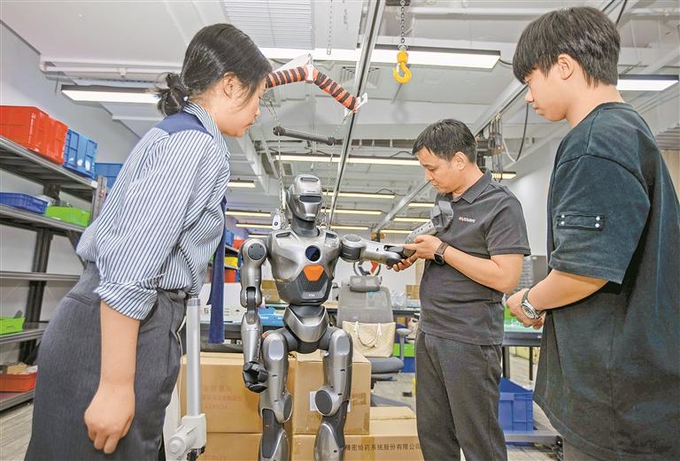 日前,南山企业众擎机器人科技有限公司人形机器人完成前空翻特技,为全球首例。图为多家有意向购买众擎机器人的客户现场调研了解。
