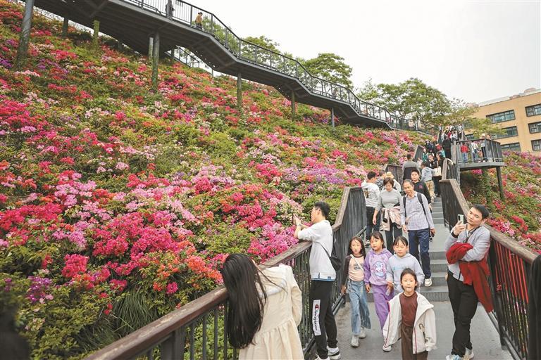 龙华区玉龙公园内簕杜鹃迎来盛放期,绵延的花带如彩绸铺展,将公园装点得如诗如画,市民纷纷携家带口前来踏青。