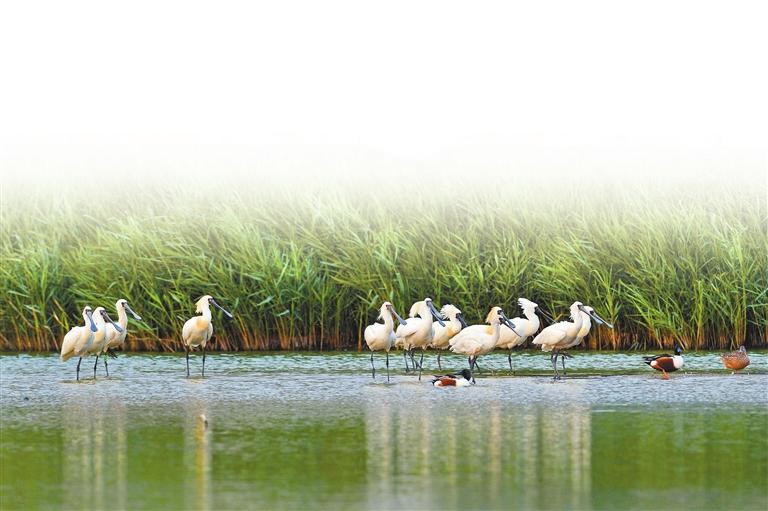 在福田红树林湿地的黑脸琵鹭。