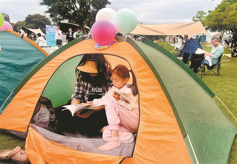 美丽的明湖公园,阳光轻铺绿草,超40顶橙色帐篷如朵朵彩霞点缀在草坪上。家长带着孩子钻进帐篷,相互依偎翻开书籍;孩子和伙伴们嬉笑着手拉手来到选书区,精挑自己喜爱的书籍,一起躲到帐篷里享受着书籍带来的愉悦……公园内设置的“帐篷阅读区”“草坪阅读区” “作家自由分享区”等主题阅读空间,让市民在大自然中感受着美妙的“诗与远方”。