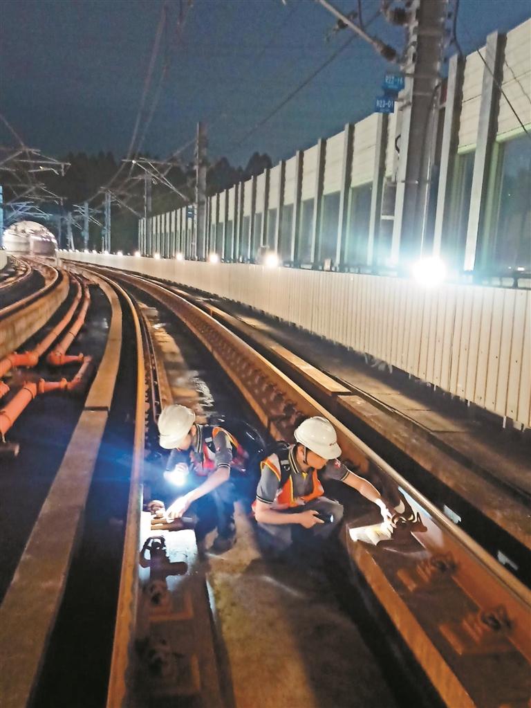 凌晨,地铁4号线工作人员开展轨道巡检。