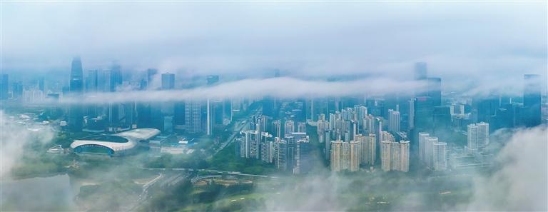 昨日,雨幕初歇,深圳氤氲在水汽中,楼宇、街道被加上一层朦胧滤镜,整座城市宛如一幅徐徐展开的水墨长卷。