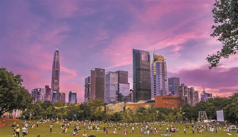 2日傍晚,深圳福田区莲花山公园的大草坪上,市民携家带口乐享假日时光。孩子们奔跑放飞各色风筝,晚霞中的城市天际线构成天然背景。这片位于市中心的城市绿地,成为市民休闲放松的热门场所。
