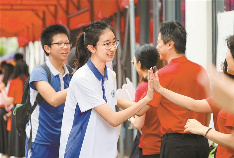 深圳中学梅香学校考点,考生在老师的鼓励下进入考场。
