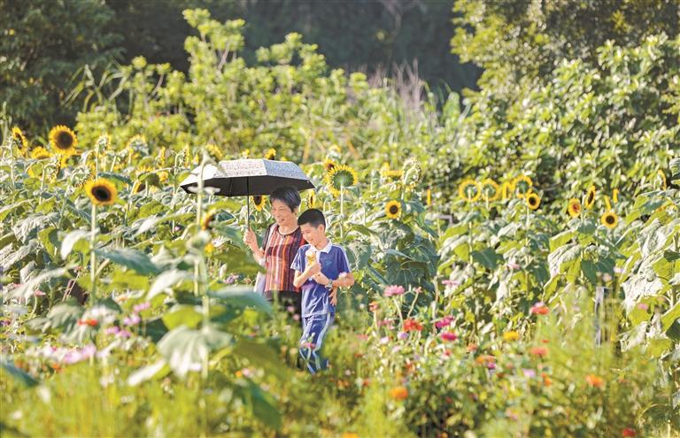 盛夏时节,深圳观澜版画村向日葵迎风盛放,金黄花海成为市民拍照打卡热门地。