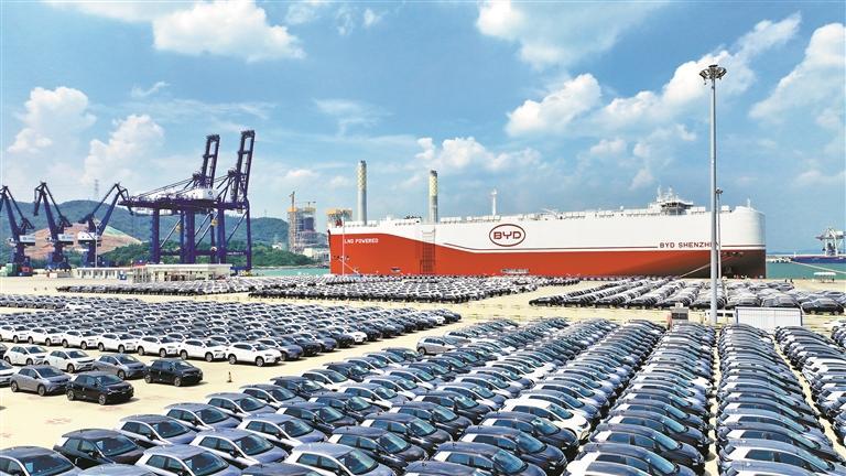 7月7日,比亚迪“深圳号”完成跨洋首航,成功返回深圳小漠国际物流港(右图)。此次航行跨越70天,超过3万公里。