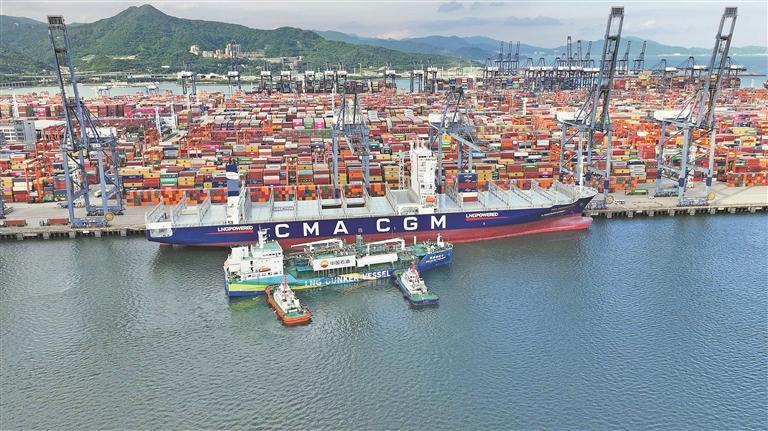 近日,深圳盐田港一派繁忙景象。大型集装箱船停靠码头,LNG加注船有序作业。