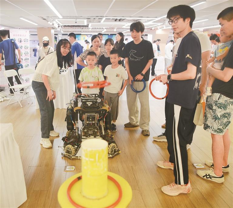 7月12日,“智趣横生·AI机器人嘉年华”公益活动在深圳书城中心城拉开帷幕。嘉年华精心打造了“深圳高校AI机器人联展”与“AI机器人科普讲座”两大板块,让青年学子与市民、少年儿童深度对话、碰撞思维火花。图为深圳技术大学学生团队制作的“套圈机器人”。