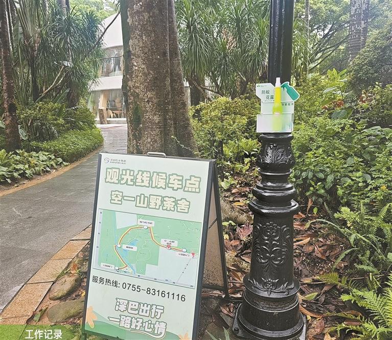 去年夏天,“深圳的公园备上了驱蚊水”就登上社交平台的同城热搜,许多市民网友称赞“深圳公园服务太贴心了”。今年,公园进一步增加驱蚊药水供应点位,特别是在登山道出入口、游客服务中心及其他重要节点提供给市民使用,并定期巡查补充,确保供应充足。 在莲花山公园、笔架山公园、深圳湾公园等处,驱蚊药水有的被悬挂在园区路口树干上,有的被挂在路灯杆上,有的放置在墙上,方便市民随取随用。不少市民在社交媒体上“晒”出逛公园时看到的驱蚊药水、花露水。网友“杳杳”表示,前几天,她在南山荔香公园散步发现免费使用驱蚊花露水。
