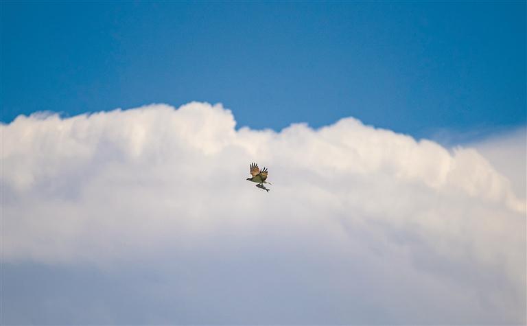 开渔现场,一只老鹰趁机捕获一条鱼。