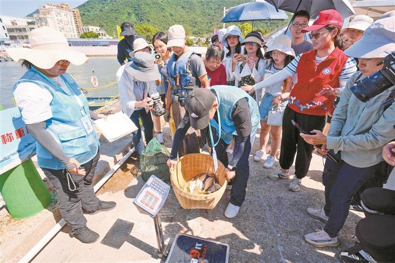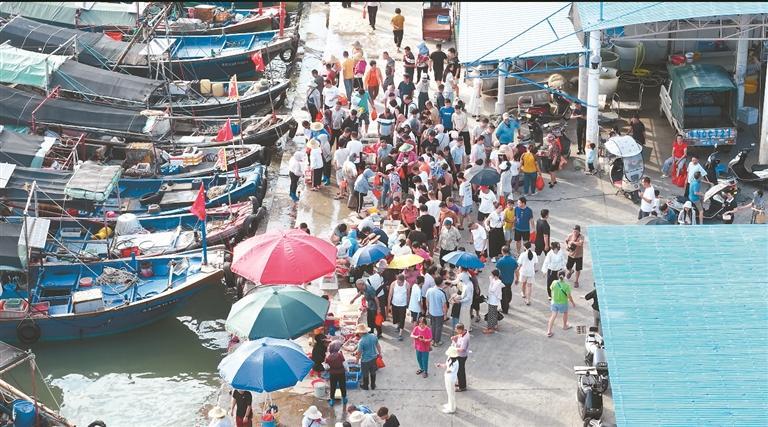 深汕特别合作区鲘门渔港码头热闹非凡,岸边挤满前来采购新鲜鱼获的民众。