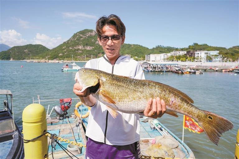 在开渔现场,一位幸运的市民钓上一条巨大的红鼓鱼。