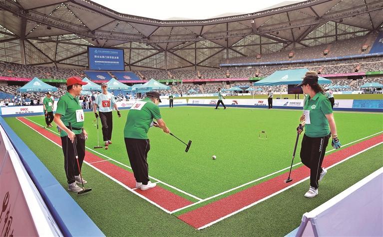 昨日,作为即将开赛的十五运门球比赛主场地,龙岗大运中心进行了最后的准备工作,运动员到场地进行适应性比赛,各项检测工作也同步完成。图为各队在适应比赛场地。