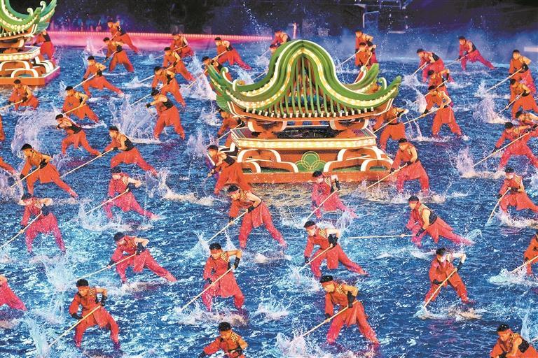 郎昆介绍,开幕式在空间叙事、艺术表达等方面都体现了三地文化交融。主舞台直观呈现“同心圆”造型,环形舞台周边是广阔的水面,运用前沿的“虚实结合”技术,让珠江、维多利亚港、伶仃洋的水波在场地中交汇奔流。这不仅是地理水系的相连,更是三地同源共流的文化血脉与手足亲情的象征。