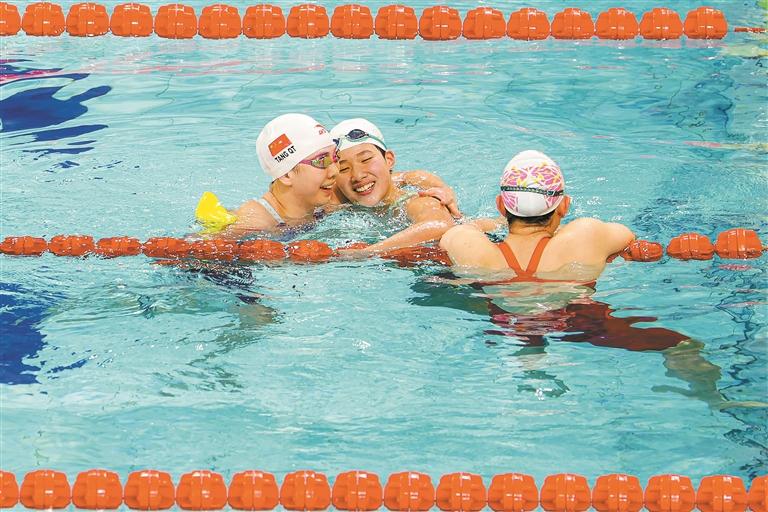 女子200米蛙泳决赛,江苏队的15岁小将吕沁遥(中)夺金后与第二名的选手唐钱婷(左)亲密相拥。