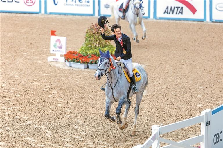 全运会马术项目收官之战——场地障碍个人赛决赛,广西队骑手木拉得力夺得金牌。