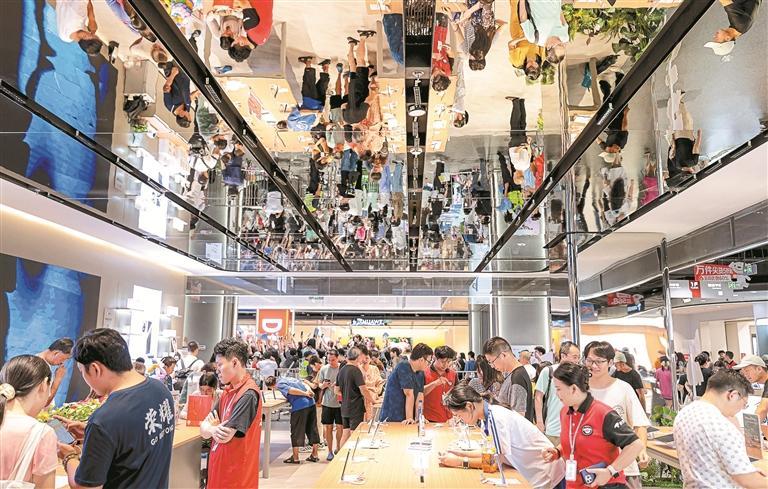 深圳京东商场华为手机、无人机等产品区人气爆棚,市民抢先体验新品,踊跃选购。