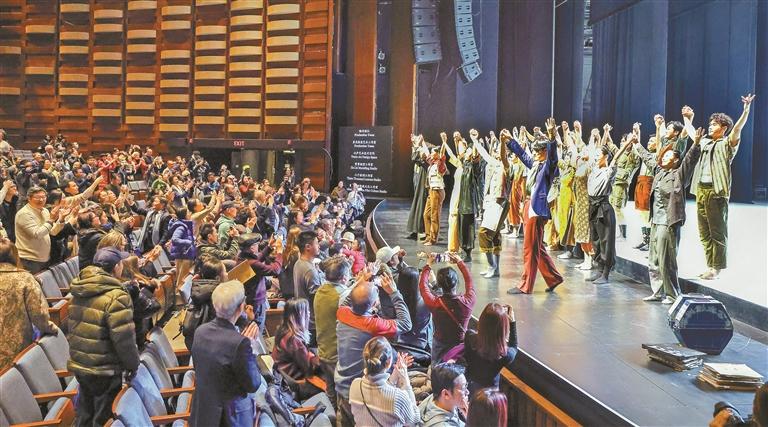 首场演出结束后,演员手牵手谢幕,现场观众欢呼声、掌声、喝彩声不绝于耳。