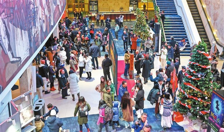 步入剧院大堂,《咏春》主视觉背景板、木人桩、咏春堂装置、咏春士多等与圣诞树和谐共融。观众们早早来到剧院,或三两结伴,或举家出行,谈笑风生,“春意”盎然。还有不少加拿大观众特意穿上了中国风服饰前来观演,打卡木人桩、比划咏春拳、参观咏春士多,在《咏春》背景板前拍照留影……人头攒动,好不热闹。