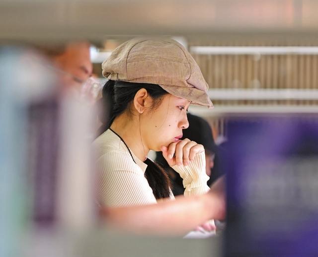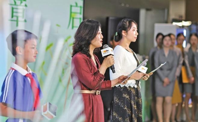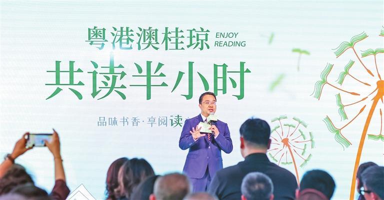 A host announces the joint half-hour reading event with Hong Kong, Macao, the Guangxi Zhuang Autonomous Region, and Hainan during Shenzhen's celebration of World Book Day at the Shenzhen Library North Division on April 23.
