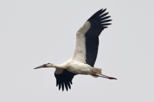 The Oriental stork is a large, elegant wading bird in the Ciconiidae family. It has a long, thick black bill that's very sturdy, with a faint purple or deep red tint at the base. The bare skin around its eyes, eye-line, and throat is bright vermilion, while its iris is pink with a black outer ring. It has extremely long, bright red legs and feet.